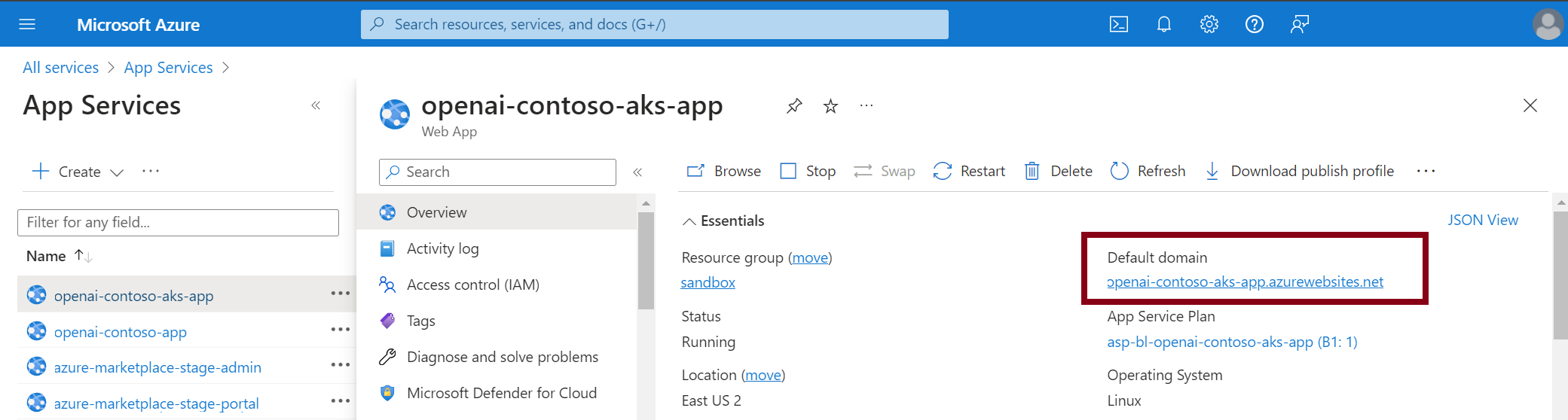 - On the App Services page, select the Contoso app service previously created.